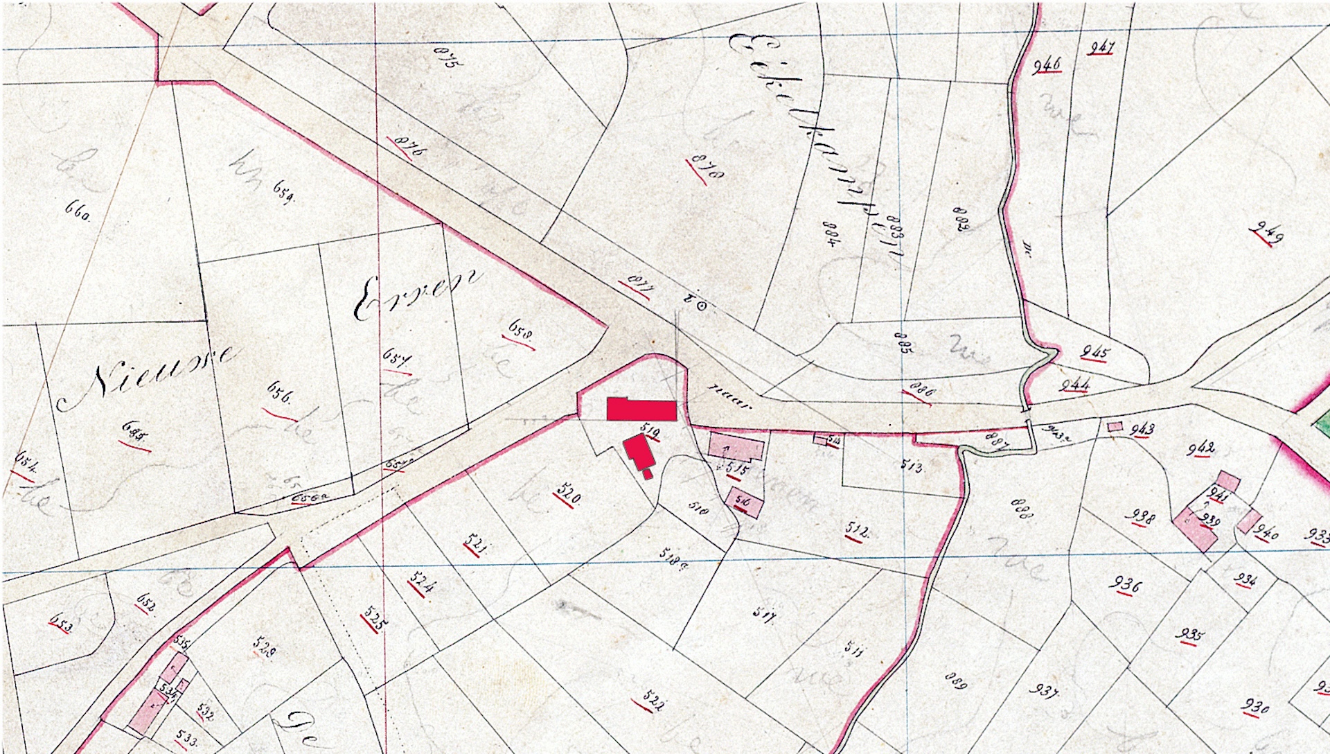 Ten gevolge van terreinverandering en vereniging van percelen verviel het kadastrale perceel A 519. Daaruit ontstond het nieuw gevormde perceel A 2150 ter grootte van 28.90 aren. Zie hulpkaart hierna.