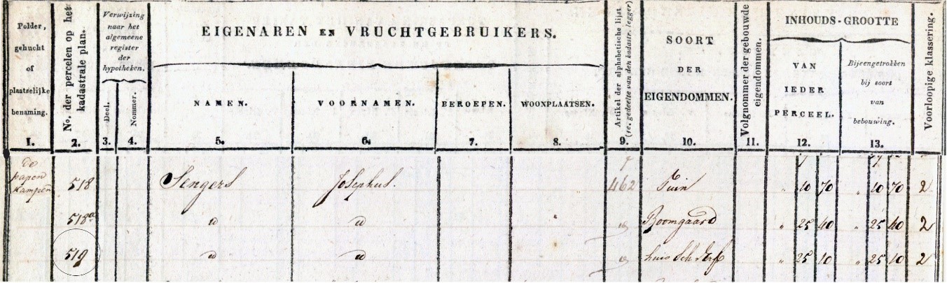 Voor Joseph Sengers werd leggerartikel 462 geopend, de nieuwe wijze van kadastrale registratie, die rond 1840 ingevoerd werd.